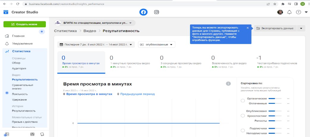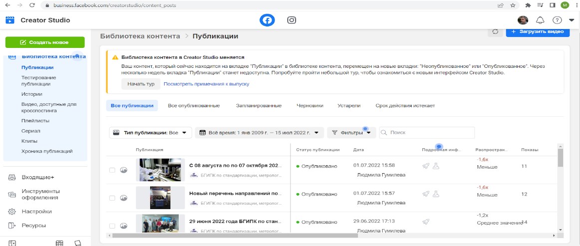В разделе «Библиотека Контента — Публикации» находится вся аналитика по публикациям. Есть возможность фильтровать по определенному типа контента. А также можно отдельно выбрать по дате опубликования, черновики и так далее.