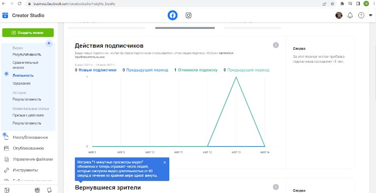 В разделе «Статистика-Лояльность» содержится информация по просмотрам ролика, их глубине и так далее. Информация за 7 дней.